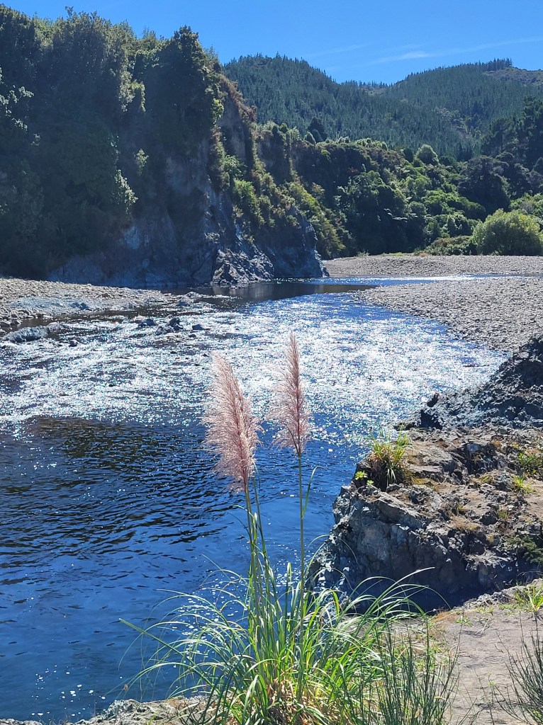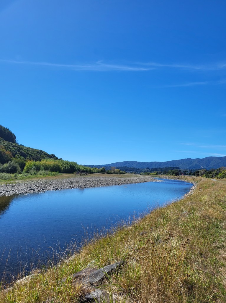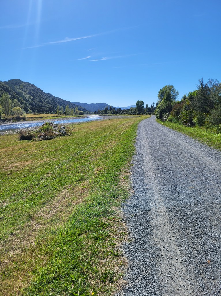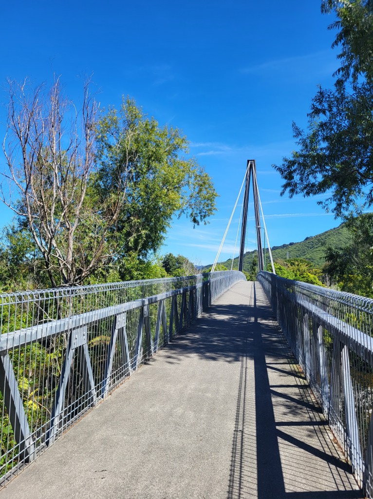 Los geht’s! Die ersten 2-3 km weitgehend immer geradeaus auf solchen Schotterpisten.Immer wieder rascheln die Blätter der Eukalyptusbäume im Wind. Entweder einzeln als Solitärbaum oder in kleinen Eukalyptushainen.Das Wasser glitzert in der Sonne, man hört tatsächlich nur den Wind, wie er die vielen verschiedenen Blätter bewegt, die Vögel sowie das Wasser des Flusses, wie es unablässig die Steine umspült..Für die Älteren unter uns: Ich würde mich hier nicht übermäßig wundern, wenn plötzlich Hoss Cartwright oder Little Joe von der Ponderosa aus „Bonanza“ hier ihre Pferd tränken würden.Hier könnte auch „Am Fuß der blauen Berge“ gedreht worden sein.Diese Brücke liegt doch tatsächlich an der „Norbert St“!Wenn man das Herz näher heranzoomt, kann man einen, wie ich finde, sehr schönen Spruch lesen.Gleich geht die Rafting-Tour los – Richtung Lower Hutt und in Petone in den Wellington Harbour.Und über allem trohnt der Panga Tree, der Silverfern, der Silberfarn.