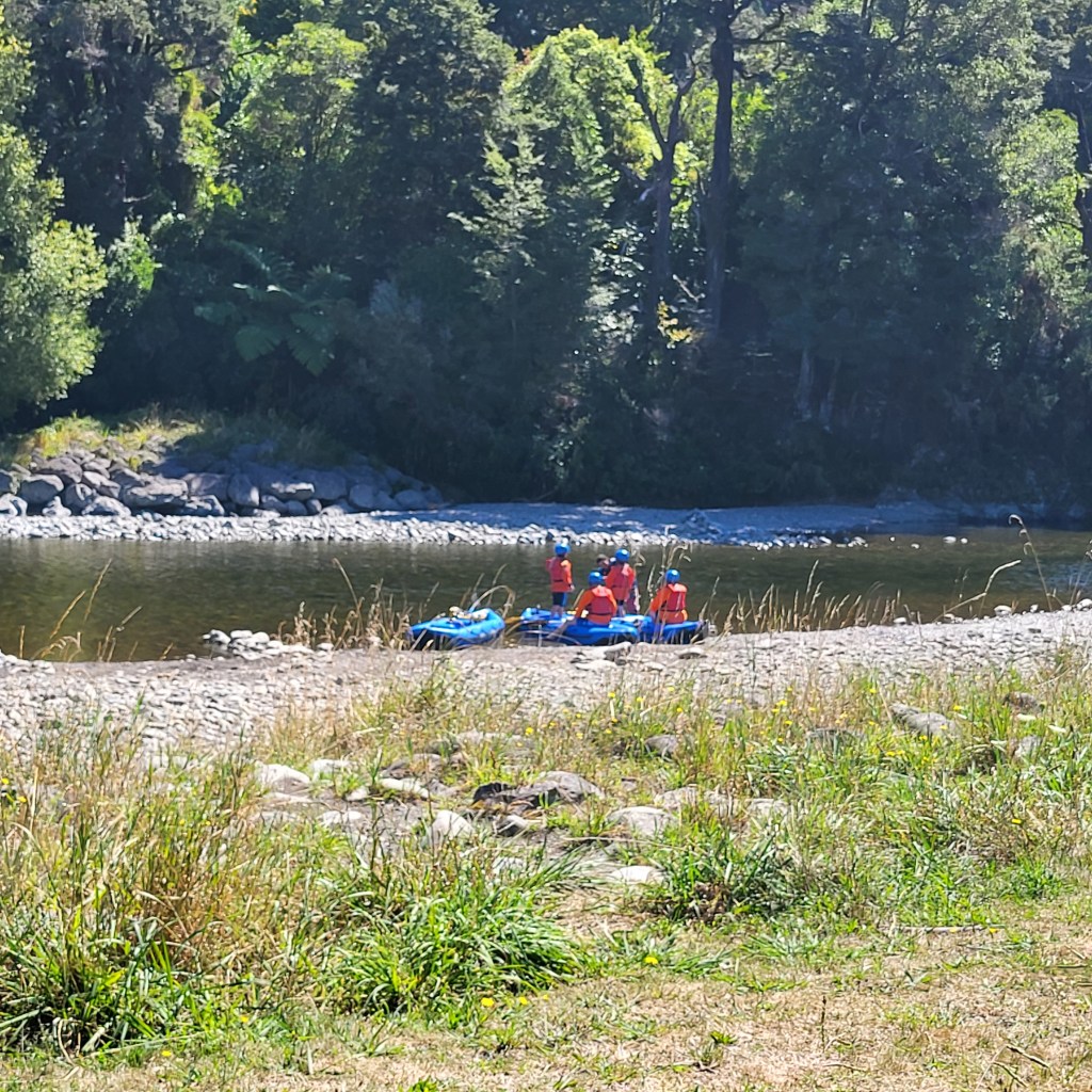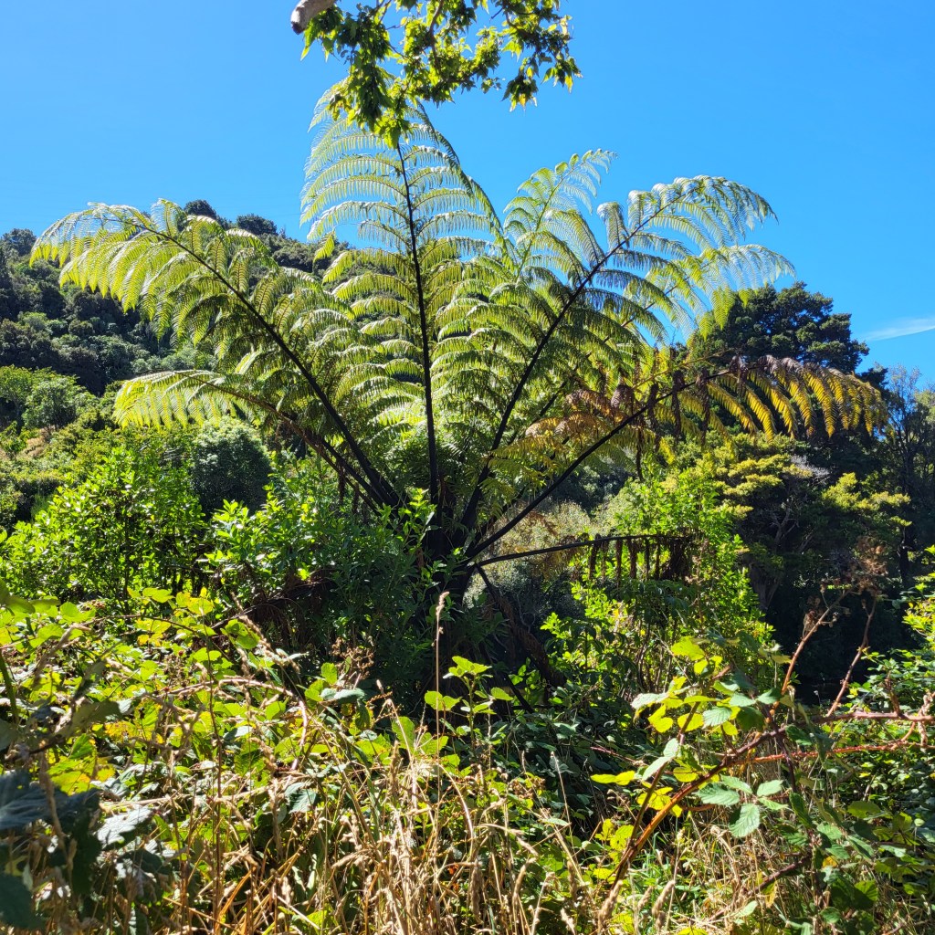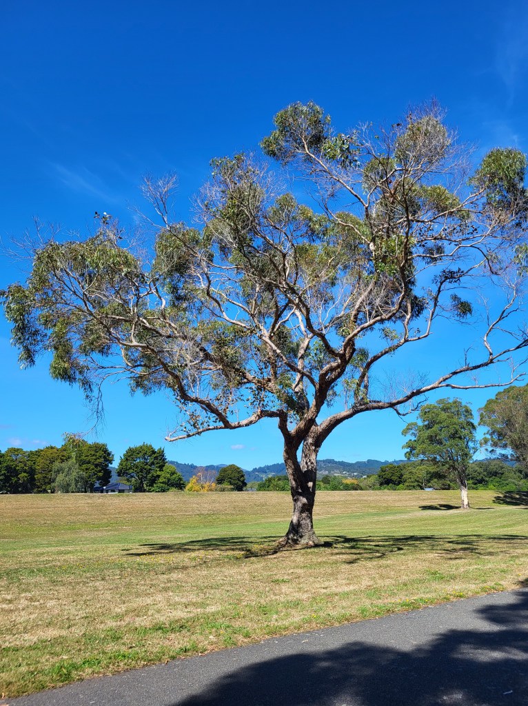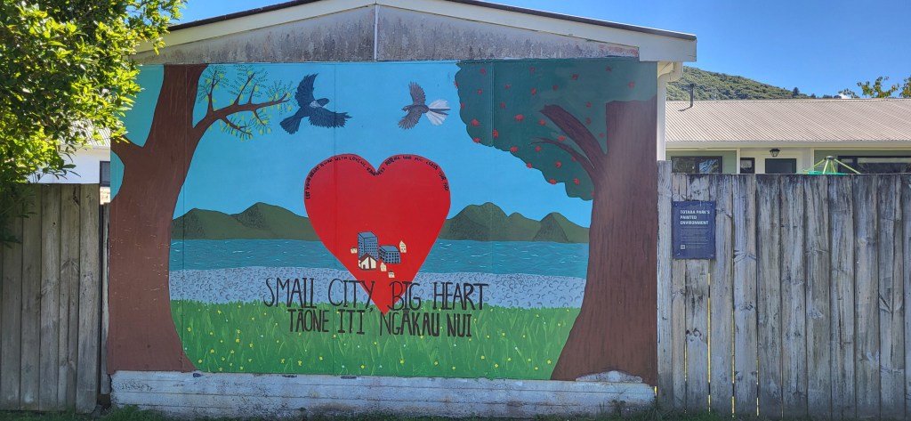 Los geht’s! Die ersten 2-3 km weitgehend immer geradeaus auf solchen Schotterpisten.Immer wieder rascheln die Blätter der Eukalyptusbäume im Wind. Entweder einzeln als Solitärbaum oder in kleinen Eukalyptushainen.Das Wasser glitzert in der Sonne, man hört tatsächlich nur den Wind, wie er die vielen verschiedenen Blätter bewegt, die Vögel sowie das Wasser des Flusses, wie es unablässig die Steine umspült..Für die Älteren unter uns: Ich würde mich hier nicht übermäßig wundern, wenn plötzlich Hoss Cartwright oder Little Joe von der Ponderosa aus „Bonanza“ hier ihre Pferd tränken würden.Hier könnte auch „Am Fuß der blauen Berge“ gedreht worden sein.Diese Brücke liegt doch tatsächlich an der „Norbert St“!Wenn man das Herz näher heranzoomt, kann man einen, wie ich finde, sehr schönen Spruch lesen.Gleich geht die Rafting-Tour los – Richtung Lower Hutt und in Petone in den Wellington Harbour.Und über allem trohnt der Panga Tree, der Silverfern, der Silberfarn.